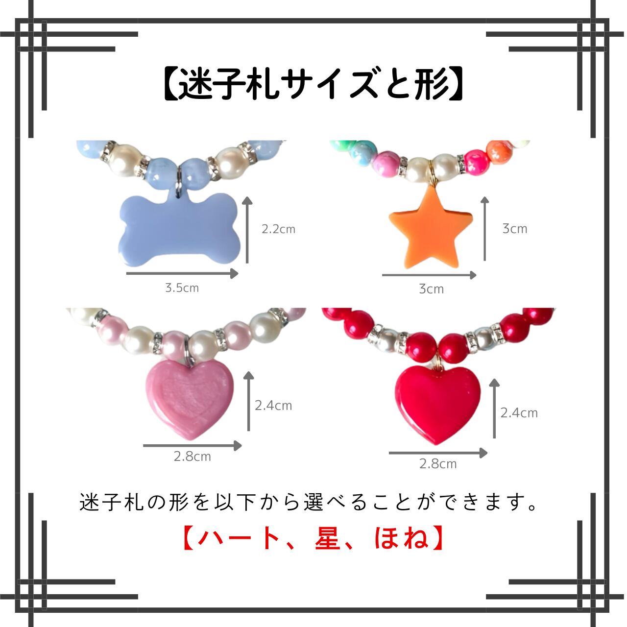 迷子札の形は3種類【ハート、星、ほね】から選べますので、大切な愛猫、愛犬に合ったオリジナルネックレスをお作りすることができます。