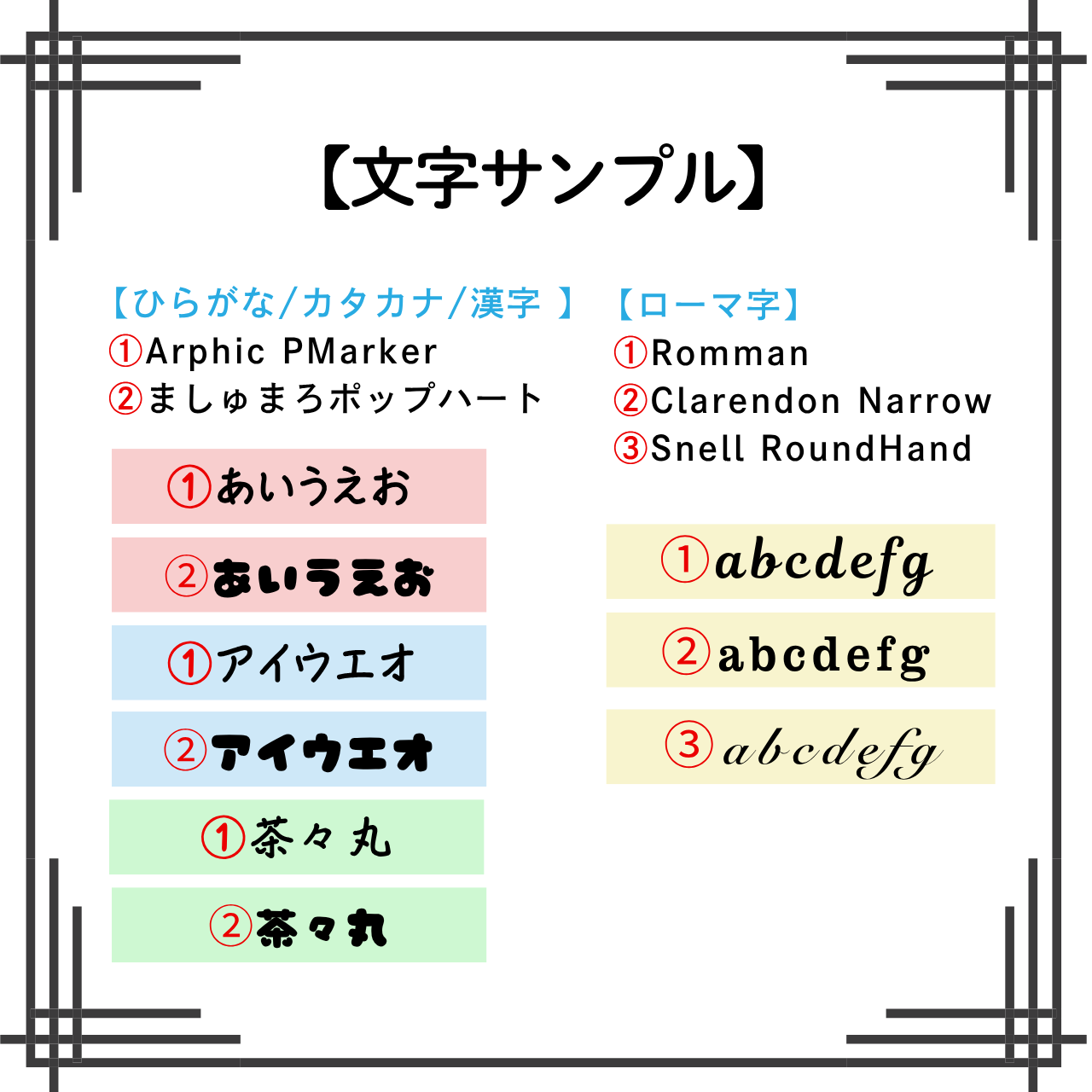 ひらがな/カタカナ/漢字(フォント①〜②)、ローマ字(フォント①〜③)でお選びいただけます。