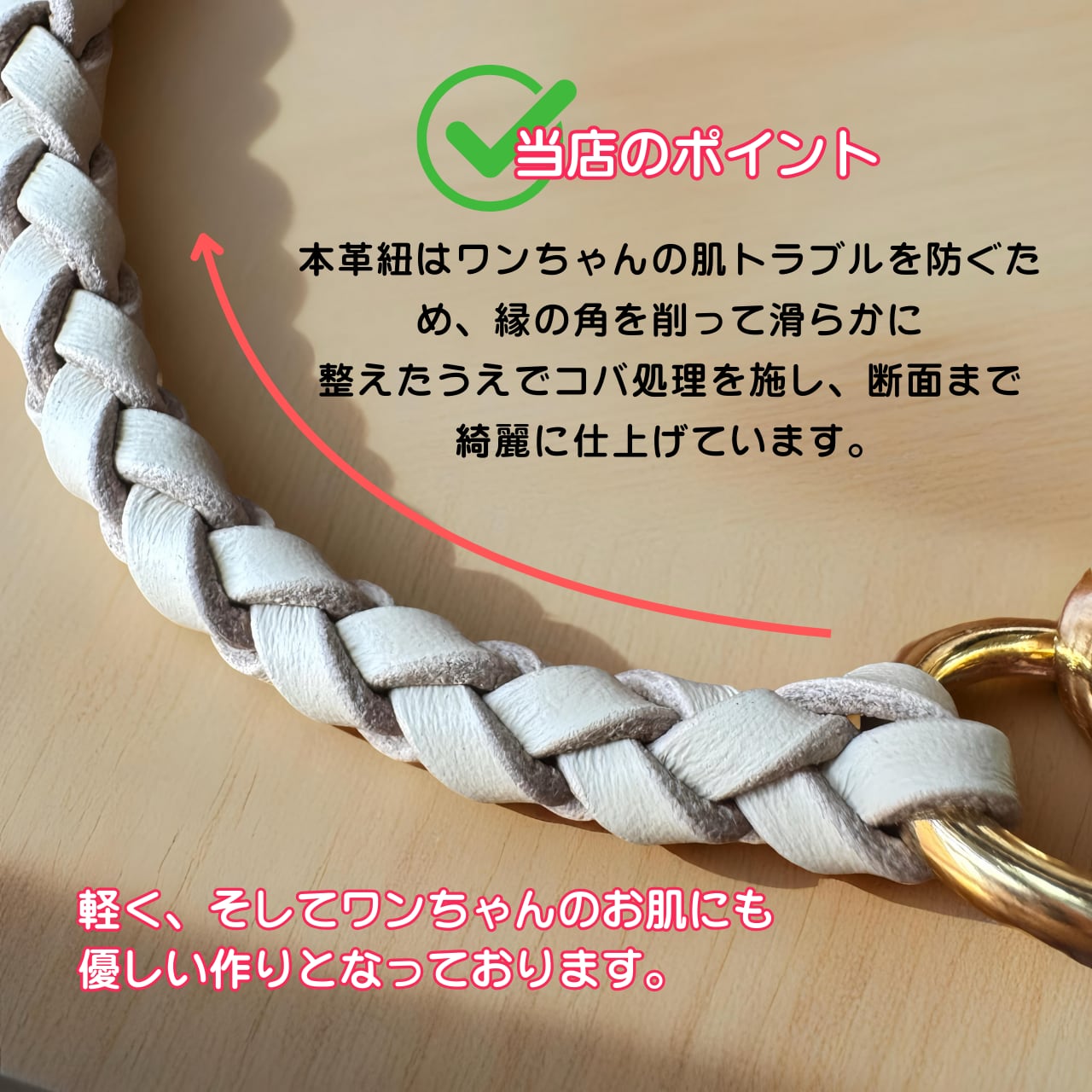 さらに、革紐は縁の角を削って滑らかに仕上げているため、ワンちゃんのお肌にも優しい作りとなっています。