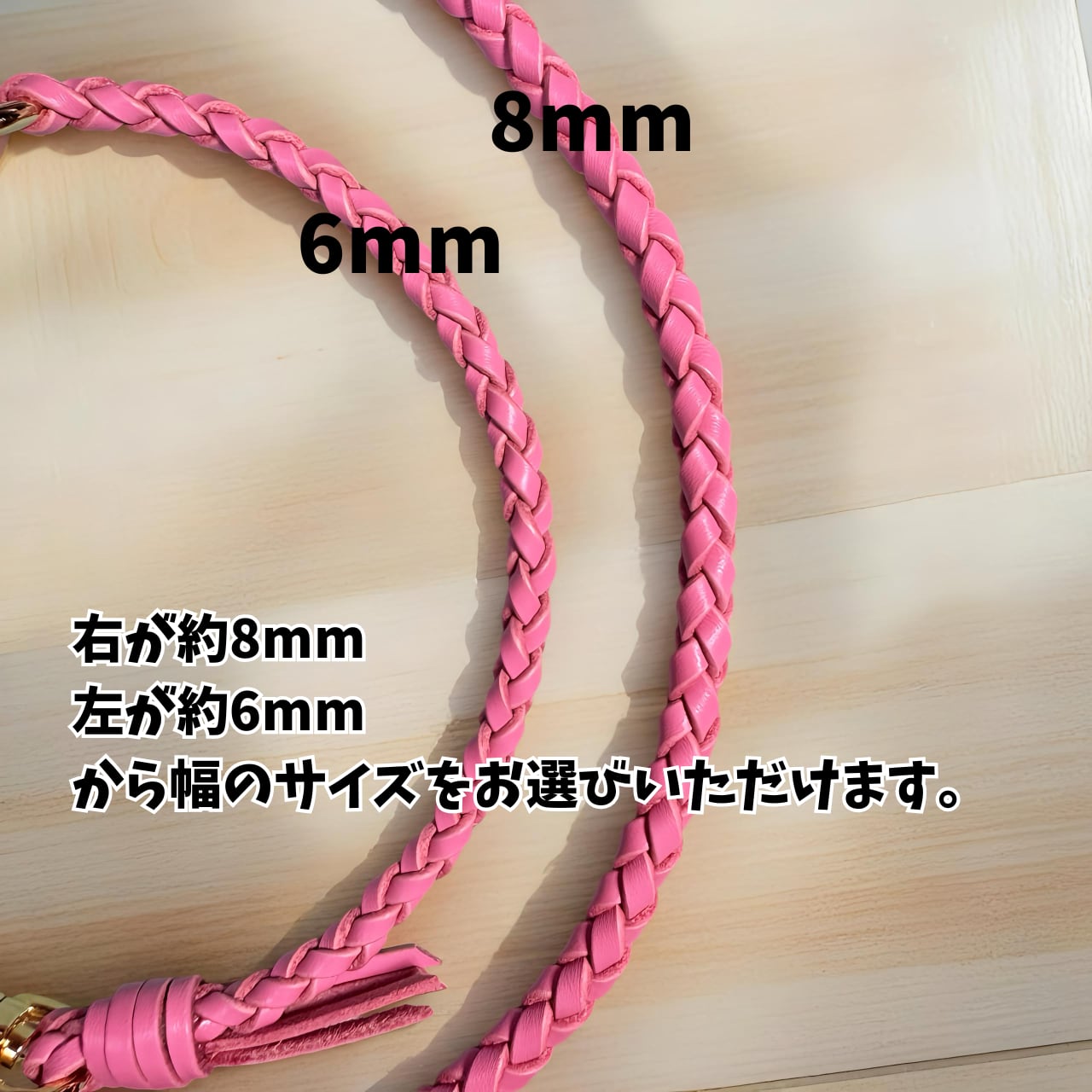 結び目部分は、紐でしっかりと結んだあと、革専用の接着剤で固定し、その上から革紐で補強しています。使用している接着剤は、熱・水・衝撃に強く、透明で無臭の安心素材です。