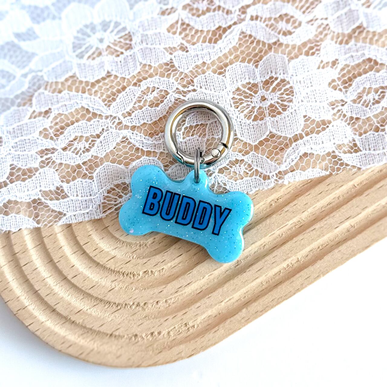 5色から選べるキラキララメが可愛い、ほね型の迷子札です。